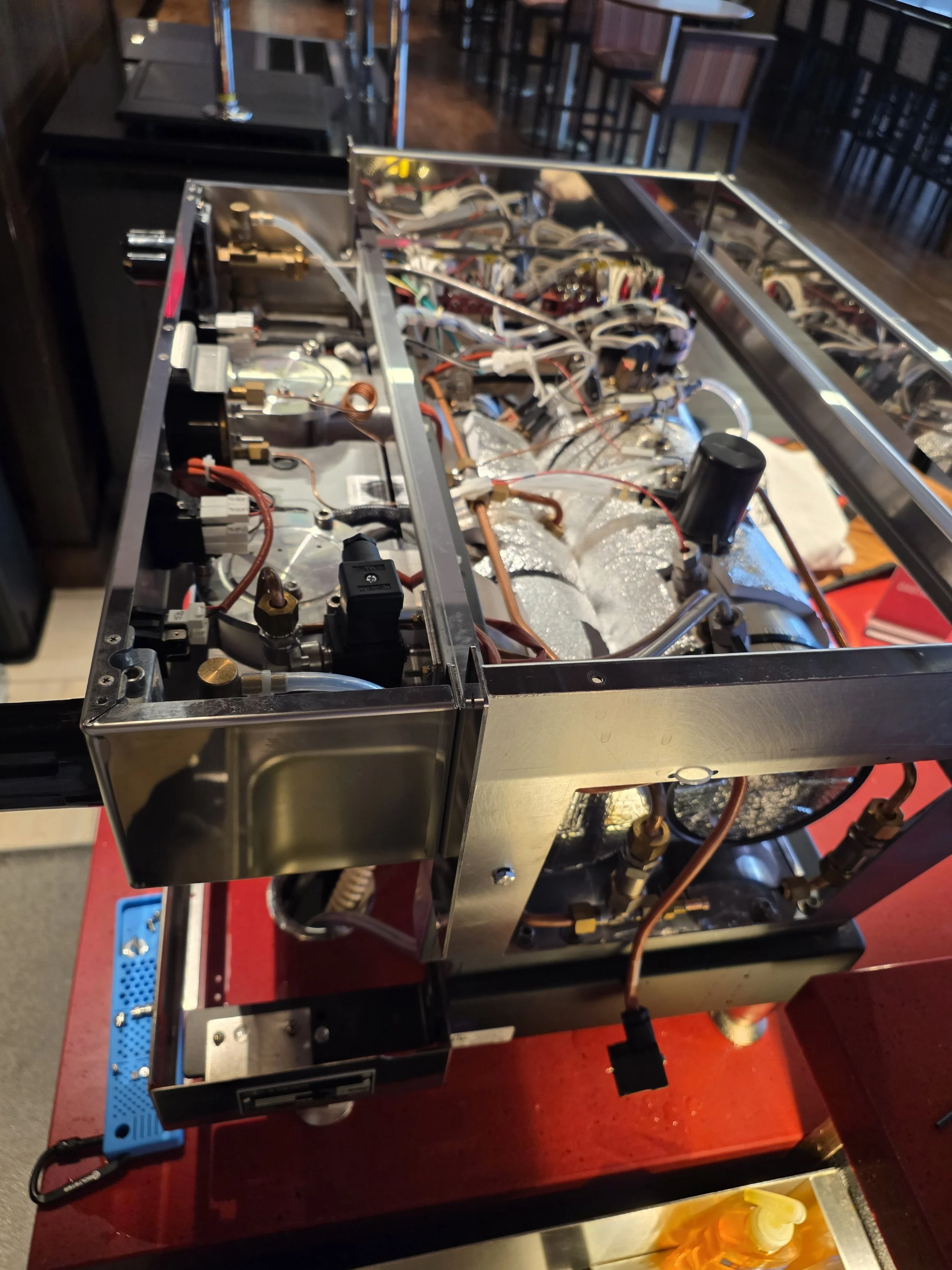 A partially assembled electronic or mechanical device with visible components, wires, and metal frame, placed on a red work surface, with a background of chairs and tables.